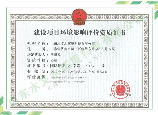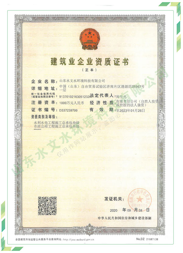 公司擁有水利工程設(shè)計(jì)、水土保持、水文水資源調(diào)查評價(jià)、水資源論證、建設(shè)項(xiàng)目環(huán)境影響評價(jià)、市政公用工程施工總承包、水利水電工程施工總承包、電子與智能化工程專業(yè)承包等資質(zhì),2017年通過質(zhì)量管理體系、環(huán)境管理體系、職業(yè)健康安全管理體系認(rèn)證;2020年被評為國家級高新技術(shù)企業(yè),同年被中國水利企業(yè)協(xié)會推薦為第一批“合同節(jié)水服務(wù)企業(yè)”;2021年被山東省、濟(jì)南市評為 “專精特新”中小企業(yè)。業(yè)務(wù)范圍涉及水利工程設(shè)計(jì);節(jié)水設(shè)計(jì)、改造、水平衡測試;山洪災(zāi)害調(diào)查;城市水資源調(diào)查評價(jià);建設(shè)項(xiàng)目水土保持方案編制、監(jiān)測、驗(yàn)收、水土保持規(guī)劃;水安全保障規(guī)劃、建設(shè)項(xiàng)目水資源論證、規(guī)劃水資源論證;建設(shè)項(xiàng)目環(huán)境影響評價(jià);入河排污口論證;防洪影響評價(jià);市政公用工程施工、水利水電工程施工、電子與智能化工程施工等。